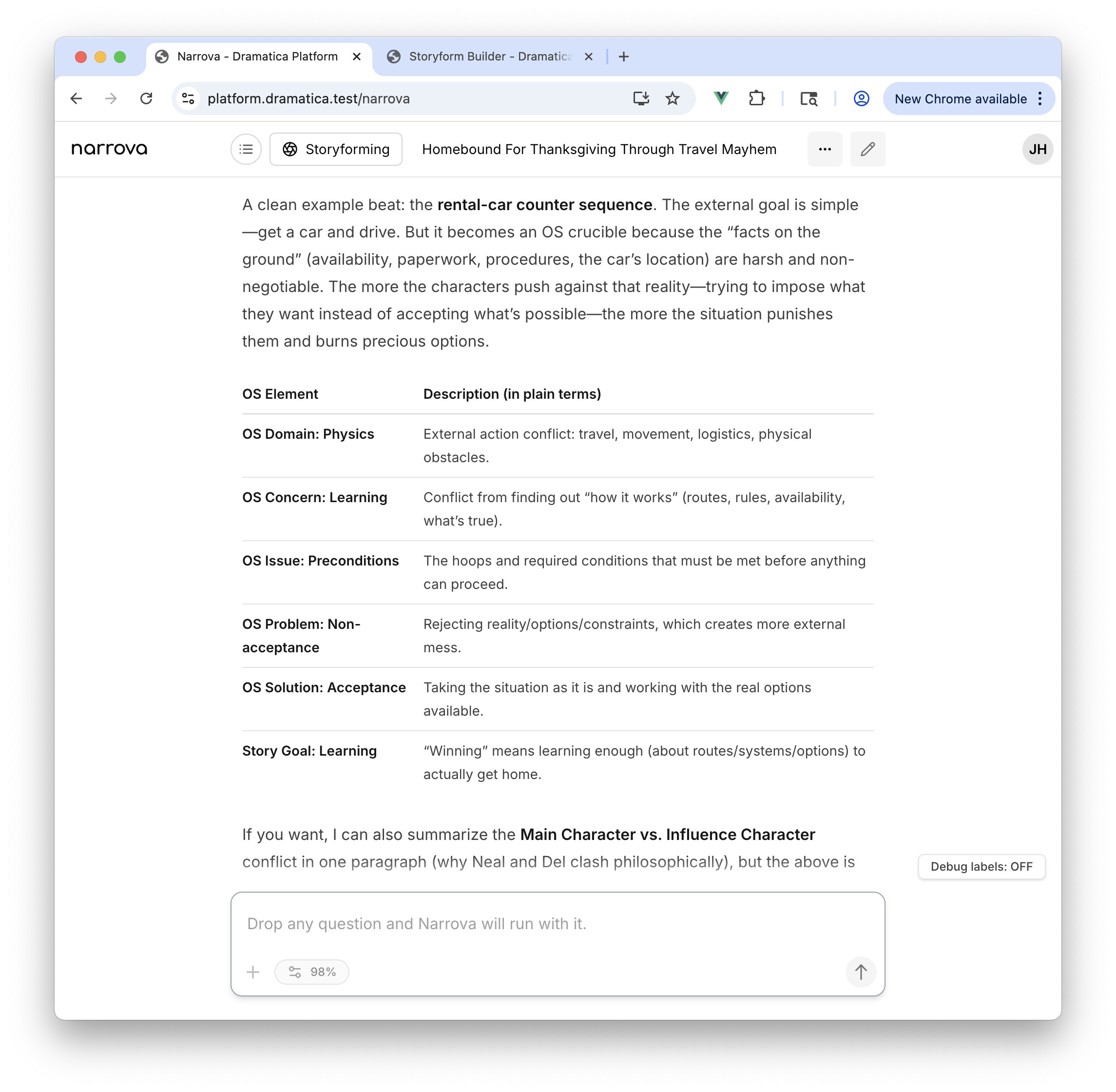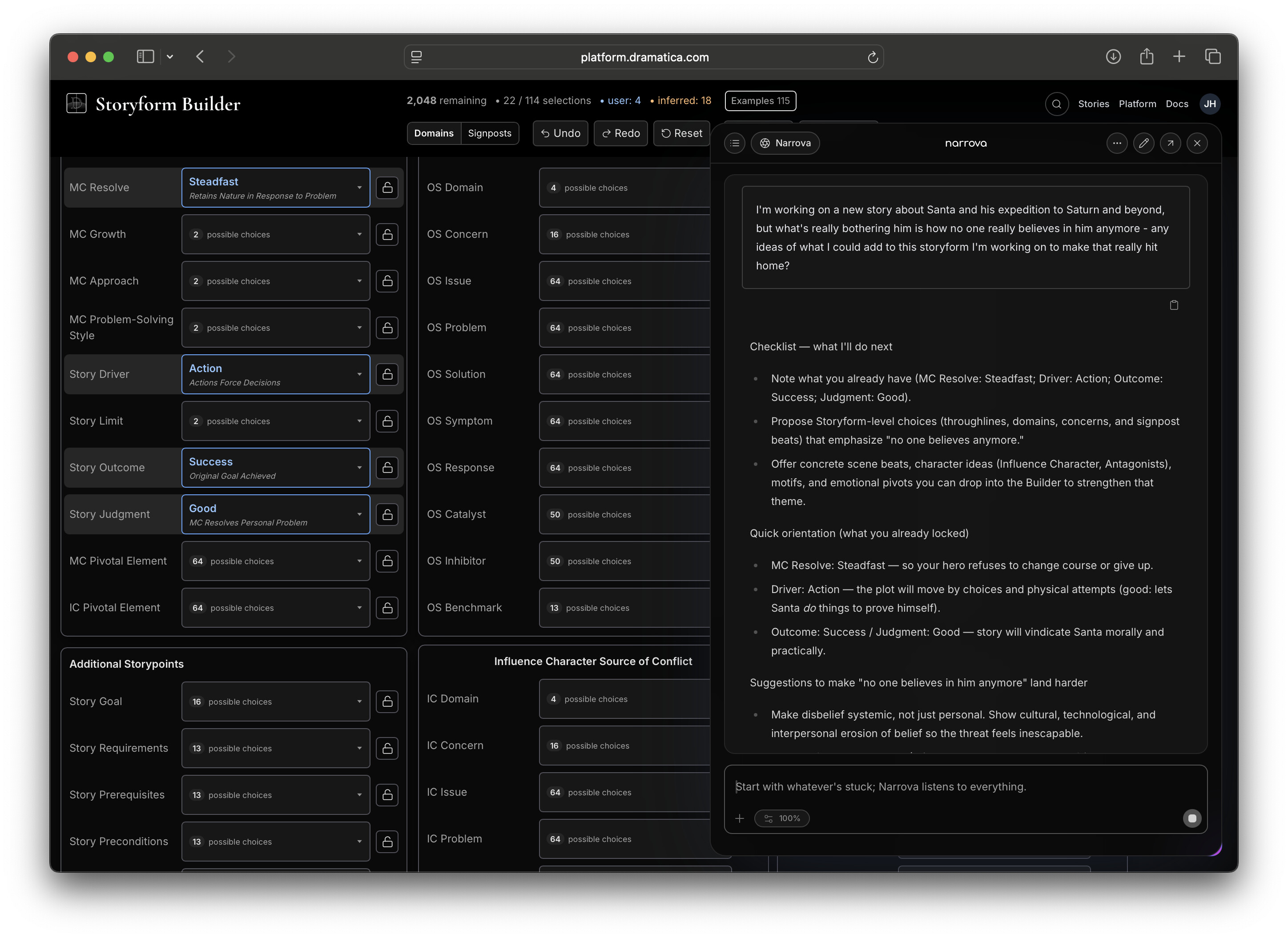 And from there, Narrova continues the conversation to keep me refining and narrowing down my story – essentially sculpting away at the Storyform.