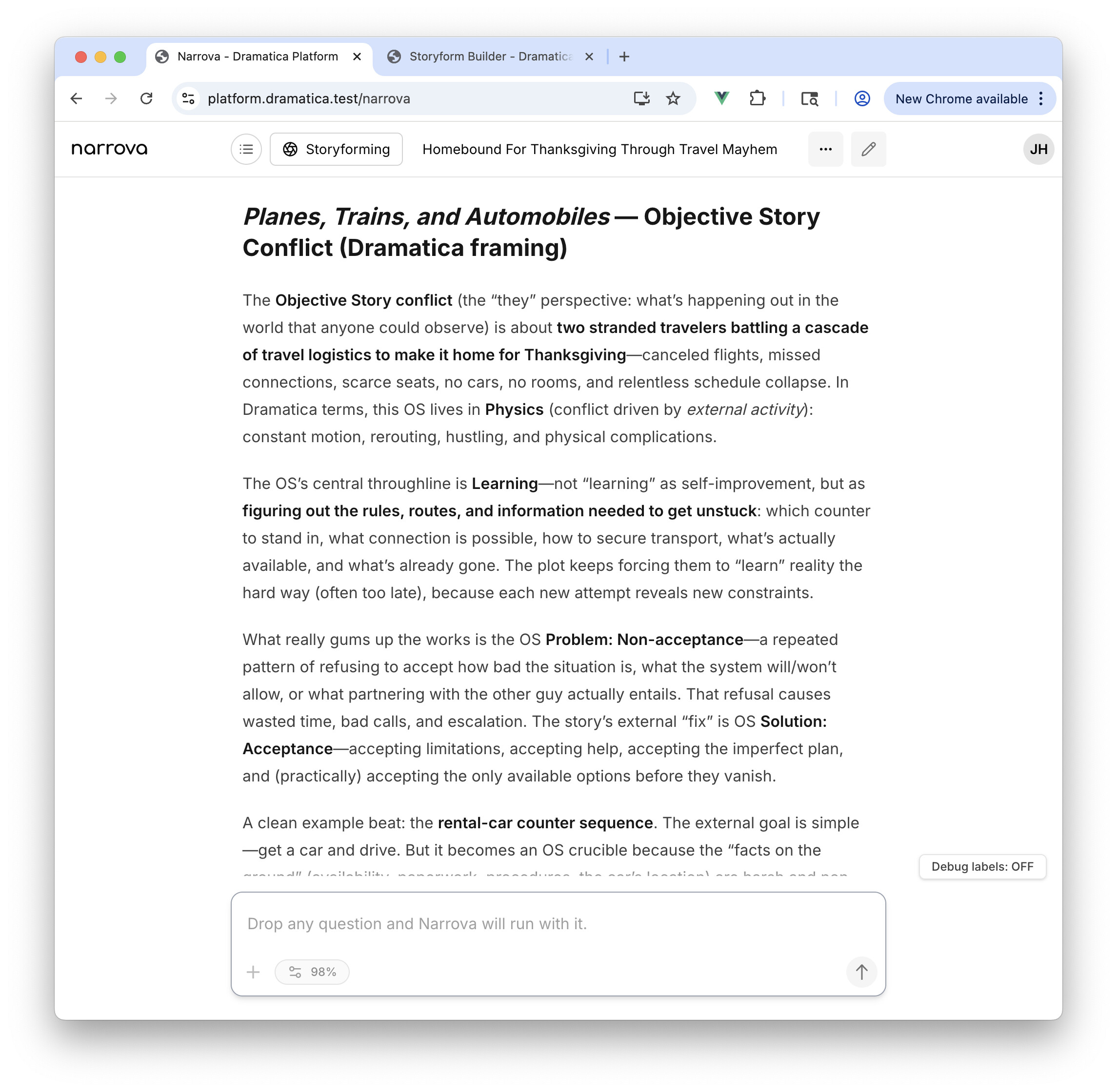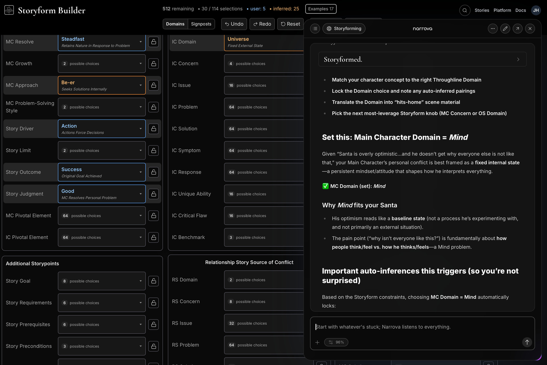 See those Orange “inferred” choices there - that’s the Storyform Builder ensuring (through the magic of Dramatica theory) that the story’s underlying subtext remains thematically consistent. Here I’ll show you by closing Narrova momentarily…