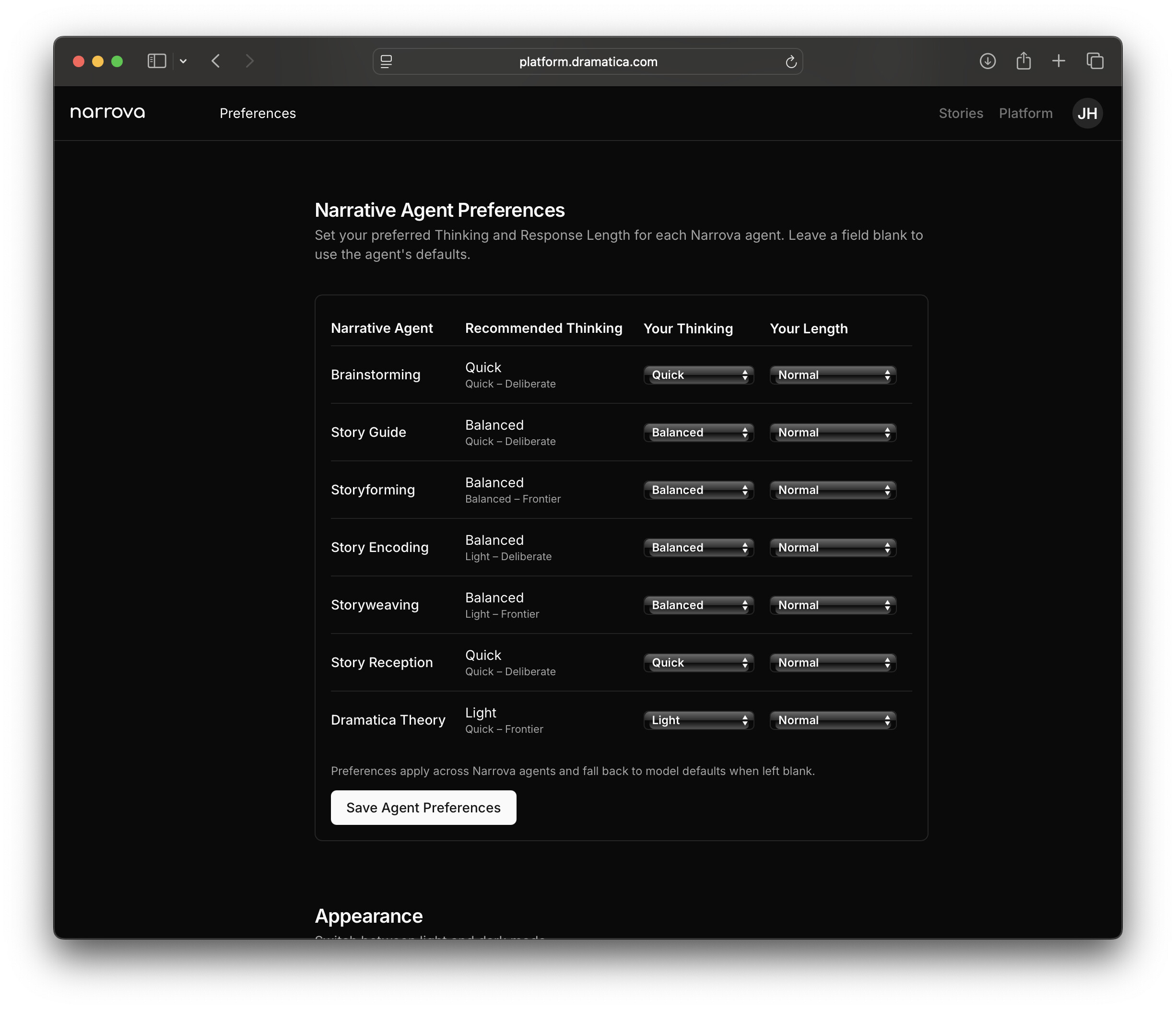 And you can always set the defaults for each Narrative Agent in your profile: