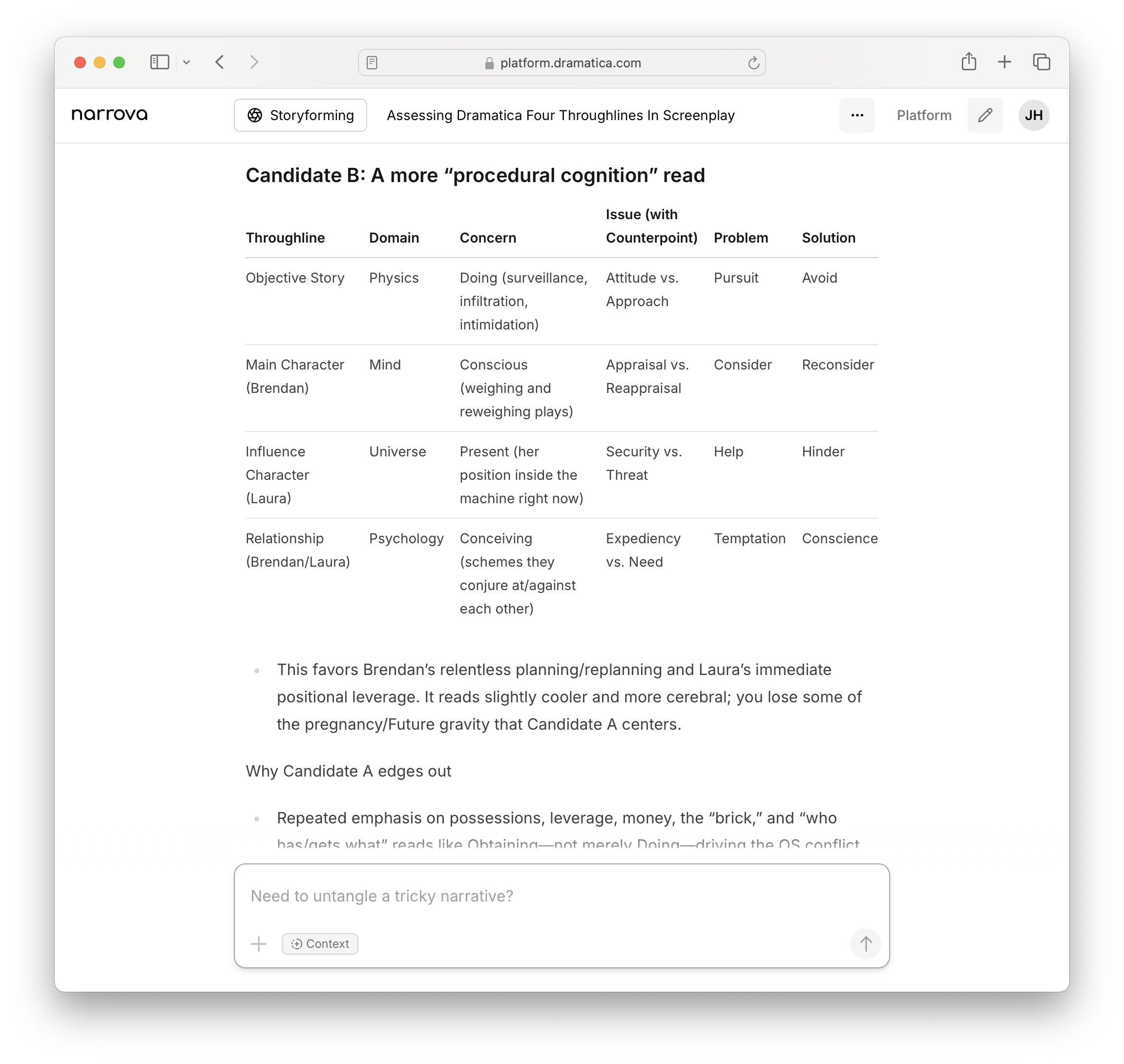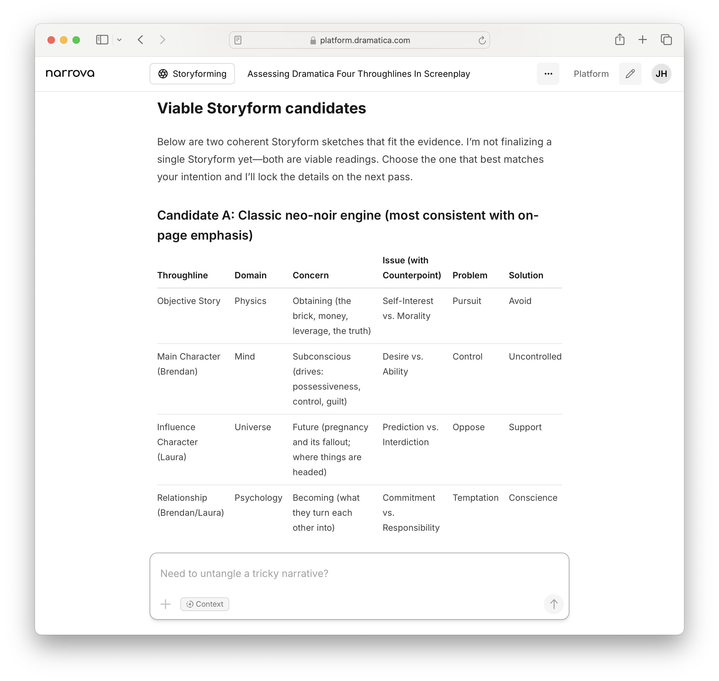 Important: Sharp-eyed Dramatica users may notice that even “close” candidates can contain theme-level contradictions (i.e., not a viable Storyform). Narrova explicitly balances what’s on the page with the Author’s aim. If you want to tighten to a strict Dramatica Storyform, say so and Narrova will prioritize internal consistency over what’s merely implied.