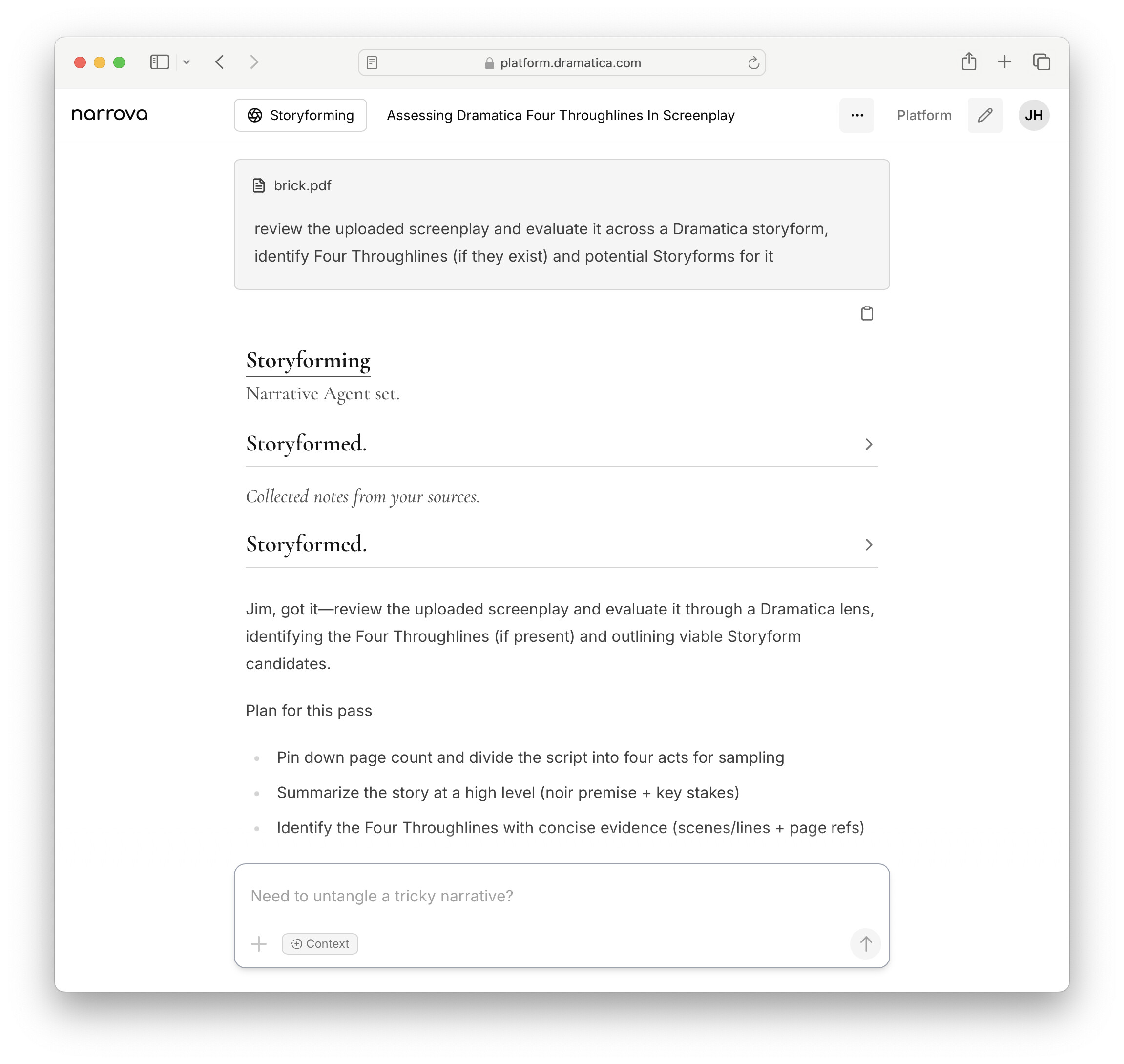 Want Narrova to read your script like a seasoned Dramatica analyst? Here’s a quick, repeatable workflow you can use right now—plus what to expect from the Storyforming Agent once it takes over.